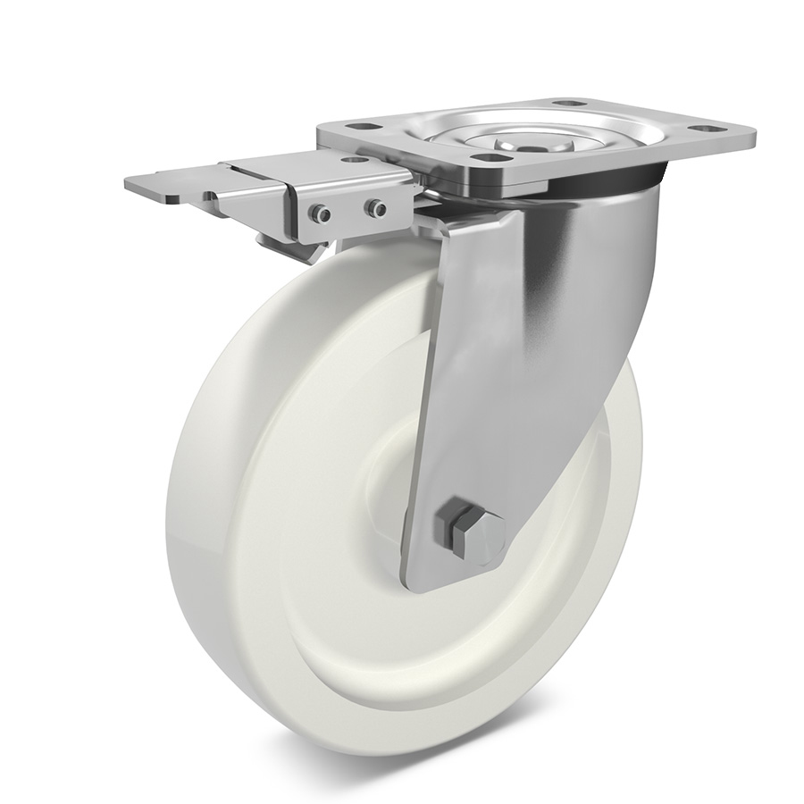 Zur letzten Seite Zur Übersicht Rostfrei - Schwerlastrollen Rostfrei - Schwerlastrollen Bockrollemit Anschraubplatte 700 - 800kg Durchmesser 125 - 200mm Gehäuse aus verstärktem Edelstahl rostfrei Polyamidrad, Gleitlager TabgruppeTechn. Daten Bestellcodemmkgmmmmmmmm 48B OTO 125 P0712570050 140 x 110105 x 80 / 75165 Bestellcode : 48B OTO 125 P07Rad ø in mm : 125Tragkraft in kg : 700Radbreite in mm : 50Plattengröße in mm : 140 x 110Schraubloch Abstand in mm : 105 x 80 / 75Schraubloch ø in mm : 11,00Ausladung Rolle in mm : 55,00Bauhöhe in mm : 165Temperaturbereich C° min / max : -20° / +80°Norm : EN 12532Laufflächenhärte : Shore D 78EAN-Code : 4250217341328 48B OTO 160 P0716080050 140 x 110105 x 80 / 75200 Bestellcode : 48B OTO 160 P07Rad ø in mm : 160Tragkraft in kg : 800Radbreite in mm : 50Plattengröße in mm : 140 x 110Schraubloch Abstand in mm : 105 x 80 / 75Schraubloch ø in mm : 11,00Ausladung Rolle in mm : 55,00Bauhöhe in mm : 200Temperaturbereich C° min / max : -20° / +80°Norm : EN 12532Laufflächenhärte : Shore D 78EAN-Code : 4250217341335 48B OTO 200 P0720080050 140 x 110105 x 80 / 75240 Bestellcode : 48B OTO 200 P07Rad ø in mm : 200Tragkraft in kg : 800Radbreite in mm : 50Plattengröße in mm : 140 x 110Schraubloch Abstand in mm : 105 x 80 / 75Schraubloch ø in mm : 11,00Ausladung Rolle in mm : 55,00Bauhöhe in mm : 240Temperaturbereich C° min / max : -20° / +80°Norm : EN 12532Laufflächenhärte : Shore D 78EAN-Code : 4250217341311 Gehäuse Gehäusebeschreibung aus verstärktem rostfreiem Edelstahl Radachse verschraubt Gehäusebeschreibung : Rad Radbeschreibung • Rad aus Polyamid natur • Gleitlager • schwere Ausführung Radbeschreibung : • Rad aus Polyamid natur • Gleitlager • schwere Ausführung catKategorie: Verwandte Produkte: