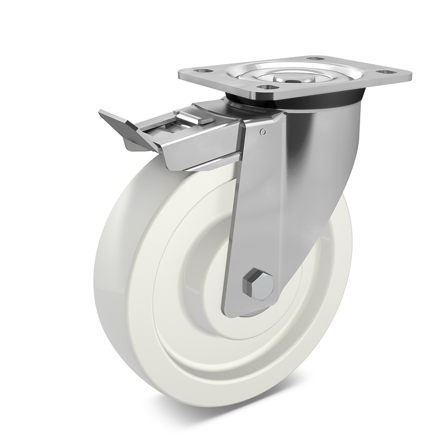 Zur letzten Seite Zur Übersicht Rostfrei - Schwerlastrollen Rostfrei - Schwerlastrollen Lenkrollemit Anschraubplatte 700 - 800kg Durchmesser 125 - 200mm Gehäuse aus verstärktem Edelstahl rostfrei Polyamidrad, Präzisionskugellager rostfrei TabgruppeTechn. Daten Bestellcodemmkgmmmmmmmm 48L OTC 125 P0712570050 140 x 110105 x 80 / 75165 Bestellcode : 48L OTC 125 P07Rad ø in mm : 125Tragkraft in kg : 700Radbreite in mm : 50Plattengröße in mm : 140 x 110Schraubloch Abstand in mm : 105 x 80 / 75Schraubloch ø in mm : 11,00Ausladung Rolle in mm : 55,00Bauhöhe in mm : 165Temperaturbereich C° min / max : -20° / +80°Norm : EN 12532Laufflächenhärte : Shore D 78EAN-Code : 4250217342097 48L OTC 160 P0716080050 140 x 110105 x 80 / 75200 Bestellcode : 48L OTC 160 P07Rad ø in mm : 160Tragkraft in kg : 800Radbreite in mm : 50Plattengröße in mm : 140 x 110Schraubloch Abstand in mm : 105 x 80 / 75Schraubloch ø in mm : 11,00Ausladung Rolle in mm : 55,00Bauhöhe in mm : 200Temperaturbereich C° min / max : -20° / +80°Norm : EN 12532Laufflächenhärte : Shore D 78EAN-Code : 4250217342103 48L OTC 200 P0720080050 140 x 110105 x 80 / 75240 Bestellcode : 48L OTC 200 P07Rad ø in mm : 200Tragkraft in kg : 800Radbreite in mm : 50Plattengröße in mm : 140 x 110Schraubloch Abstand in mm : 105 x 80 / 75Schraubloch ø in mm : 11,00Ausladung Rolle in mm : 55,00Bauhöhe in mm : 240Temperaturbereich C° min / max : -20° / +80°Norm : EN 12532Laufflächenhärte : Shore D 78EAN-Code : 4250217342110 Gehäuse Gehäusebeschreibung aus verstärktem rostfreiem Edelstahl Schwenklager mit zweifachem Kugelkranz Schwenklagerschutz Radachse verschraubt Gehäusebeschreibung : Rad Radbeschreibung • Rad aus Polyamid natur • Präzisionskugellager rostfrei • schwere Ausführung Radbeschreibung : • Rad aus Polyamid natur • Präzisionskugellager rostfrei • schwere Ausführung catKategorie: Verwandte Produkte: